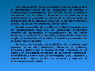 Este documento presenta el programa de literatura y TICs para estudiantes de segundo ciclo en el colegio Atahualpa Yupanqui. El programa busca fomentar la participación activa de los estudiantes en experiencias de oralidad, lectura y escritura vinculadas con la literatura a través de talleres que utilizan libros, netbooks, películas y otras tecnologías. Los estudiantes explorarán géneros literarios como leyendas, fábulas, cuentos, poesía y novelas usando aplicaciones como Word,