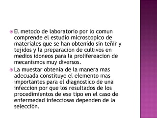 El documento describe los métodos de laboratorio para el diagnóstico de infecciones, incluyendo la obtención y transporte adecuado de muestras, técnicas de tinción como la tinción de Gram y Ziehl-Neelsen, medios de cultivo y su diseño, y pruebas inmunológicas como aglutinación, inmunoensayos y hemocultivos. El objetivo principal es aislar e identificar los agentes infecciosos presentes en las muestras para realizar un diagnóstico preciso.