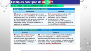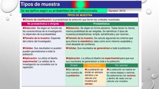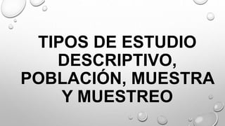 Este documento describe los tipos de estudios descriptivos, la población y el muestreo. Los estudios descriptivos pueden ser transversales u longitudinales, prospectivos o retrospectivos, e individuales o poblacionales. La población se refiere al grupo objetivo sobre el cual se generalizarán las conclusiones, mientras que la muestra es un subgrupo de la población. Existen muestras probabilísticas y no probabilísticas, y el muestreo es una herramienta para determinar qué parte de la población examinar para hacer inferencias sobre la población