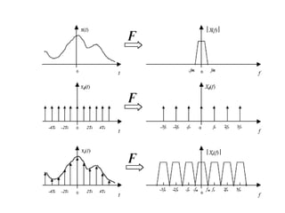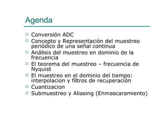 Este documento trata sobre la conversión de señales analógicas a digitales a través del muestreo, cuantización y codificación. Explica conceptos clave como el teorema de muestreo de Nyquist, que establece que la frecuencia de muestreo debe ser al menos el doble de la frecuencia máxima contenida en la señal, para poder reconstruir la señal original. También describe diferentes métodos de muestreo e interpolación, y los errores asociados con la cuantización.