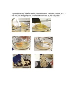 Este documento presenta una receta para muffins de plátano y chocolate. La receta incluye ingredientes como plátanos, mantequilla, huevos, azúcar, harina, polvo para hornear, bicarbonato de sodio, sal y chispas de chocolate. La preparación implica aplastar los plátanos, mezclarlos con los demás ingredientes secos y líquidos, agregar las chispas de chocolate a la mezcla, rellenar moldes para muffins con la masa y hornear durante 12-15 minutos.