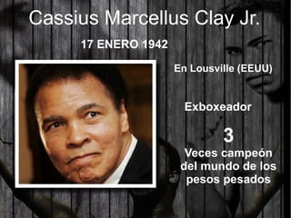 Este documento resume la carrera boxística de Cassius Clay, también conocido como Muhammad Ali. Fue tres veces campeón mundial de los pesos pesados, ganando títulos olímpicos y nacionales como aficionado. Tuvo una marca profesional de 56 victorias y 5 derrotas, derrotando a boxeadores como Sonny Liston, Joe Frazier y George Foreman. Ali fue conocido por sus provocaciones verbales y se le considera uno de los mejores pesos pesados de la historia.