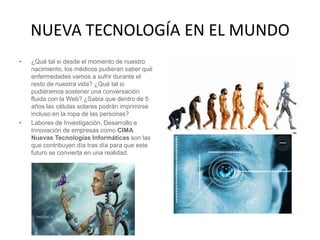 El documento describe varias innovaciones tecnológicas que podrían estar disponibles en los próximos 5 a 50 años, incluyendo la capacidad de predecir enfermedades futuras basadas en el ADN de una persona, interfaces de voz para interactuar con sitios web, asistentes digitales integrados en probadores de tienda, y dispositivos que ayudan a recordar detalles de la vida diaria al almacenar y analizar conversaciones y actividades. También se mencionan avances futuros en energía solar, salud, transporte aéreo, e ingeniería