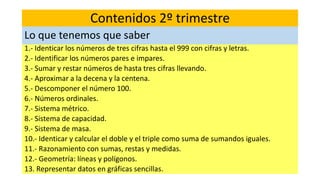 Este documento presenta los contenidos de matemáticas para el segundo trimestre de segundo grado de primaria. Incluye temas como la identificación y cálculo de números de tres cifras, la suma y resta con y sin llevar, la aproximación a decenas y centenas, los sistemas métrico, de capacidad y masa, el doble y triple como suma de sumandos iguales, geometría básica de líneas y polígonos, y la representación de datos en gráficas sencillas.