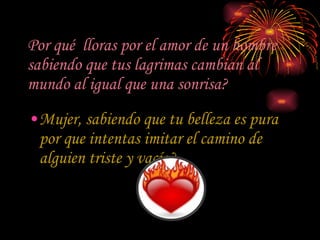 Este poema celebra a la mujer como la diosa de la belleza y la ternura. Destaca que la mujer no debe llorar por un hombre ni imitar a otros tristes, sino que debe valorar su propia belleza pura. La describe como tierna, pura, casta, hermosa, paciente, sensible y delicada. El poema expresa que la mujer es la rosa de la belleza y la madre de la paciencia, y que sin ella la vida sería oscura. Finalmente, desea a todas las mujeres un feliz día.