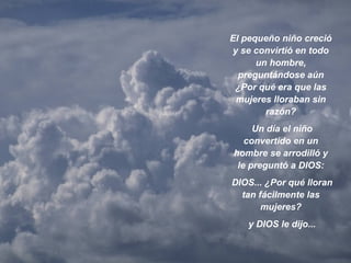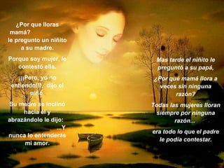 El documento narra la historia de un niño que no comprende por qué su madre llora a veces. Al crecer, le pregunta a su padre y a Dios por qué las mujeres lloran sin razón. Dios le explica que dotó a la mujer de gran fortaleza interior y sensibilidad para soportar el dolor y el rechazo, pero también le dio las lágrimas para desahogarse y verter amor a través de ellas, salvando así a la humanidad. El hombre comprende entonces el sentir de las mujeres en su vida.