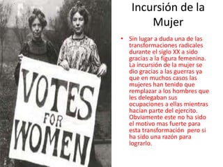 El documento describe la transformación de la mujer en el siglo XX. Gracias a las guerras, las mujeres tuvieron que asumir los roles de los hombres que estaban en el ejército, lo que les permitió incursionar en nuevos ámbitos. Las mujeres emprendedoras lucharon por la igualdad de derechos, incluyendo el voto y la posibilidad de ser elegidas. A pesar de las burlas, demostraron que podían ser exitosas en diversas áreas como las artes, la política y el diseño, al tiempo que cumplían con sus roles
