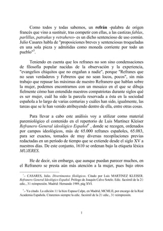 Este documento resume la imagen de la mujer que se presenta en los refranes españoles. Según el análisis, los refranes muestran a la mujer como un ser contradictorio que puede ser bueno o malo, y cuya naturaleza débil la hace dependiente del hombre. El refranero también sugiere que las mujeres carecen de talento e inteligencia y son propensas a causar problemas. Sin embargo, también reconoce que las mujeres desempeñan roles importantes como madres y esposas.
