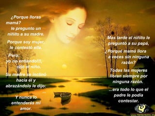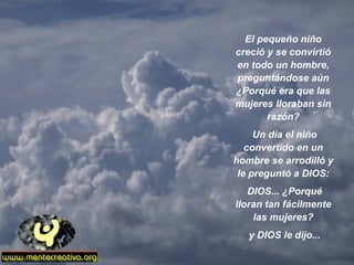 El niño le pregunta a su madre por qué llora a veces sin razón. Su padre le dice que todas las mujeres lloran sin razón. Cuando es adulto, le pregunta a Dios por qué las mujeres lloran fácilmente. Dios explica que dio a la mujer la fortaleza para soportar el peso del mundo y el dolor del parto, pero también las lágrimas para desahogarse cuando sea necesario y verter amor a través de ellas para salvar a la humanidad. El hombre ahora comprende por qué su madre y otras mujeres derraman lágrimas.