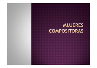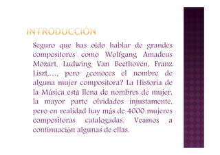 El documento destaca la notable contribución de más de 4000 mujeres compositoras a lo largo de la historia de la música, muchas de las cuales fueron olvidadas. Se mencionan figuras destacadas como Hildegarda de Bingen, Francesca Caccini y Clara Schumann, que enfrentaron desafíos significativos en un mundo dominado por hombres, pero dejaron un legado musical impresionante. El texto también incluye una extensa lista de compositoras a lo largo de diversas épocas, subrayando la importancia de reconocer su influencia en la música.