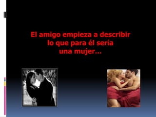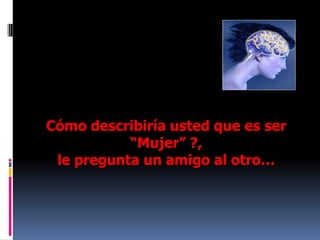 Este documento describe lo que significa ser una mujer desde varias perspectivas. Al principio, un hombre describe a una mujer físicamente, pero otro hombre luego explica que una mujer es aquella que trabaja arduamente para cuidar a su familia y el hogar, es fuerte y compasiva, y busca a Dios. El documento concluye celebrando a todas las mujeres y enfatizando su gran valor.
