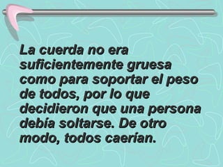 Once personas se aferraban a una cuerda de helicóptero que no era lo suficientemente gruesa para soportarlos a todos, por lo que una persona debía soltarse para evitar que cayeran todos. La única mujer del grupo se ofreció voluntariamente para soltarse, diciendo que como madre, esposa, hija y profesional siempre anteponía los intereses de los demás a los propios.