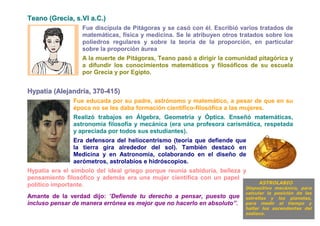 El documento presenta breves biografías de importantes mujeres matemáticas a lo largo de la historia, desde Teano en el siglo VI a.C. hasta Gertrude Cox en el siglo XX. Algunas de las mujeres destacadas son Hipatia, Émilie du Châtellet y Sofía Kovalevskaya, que hicieron contribuciones fundamentales a las matemáticas y ciencias a pesar de las dificultades que enfrentaron por ser mujeres en sus épocas respectivas.