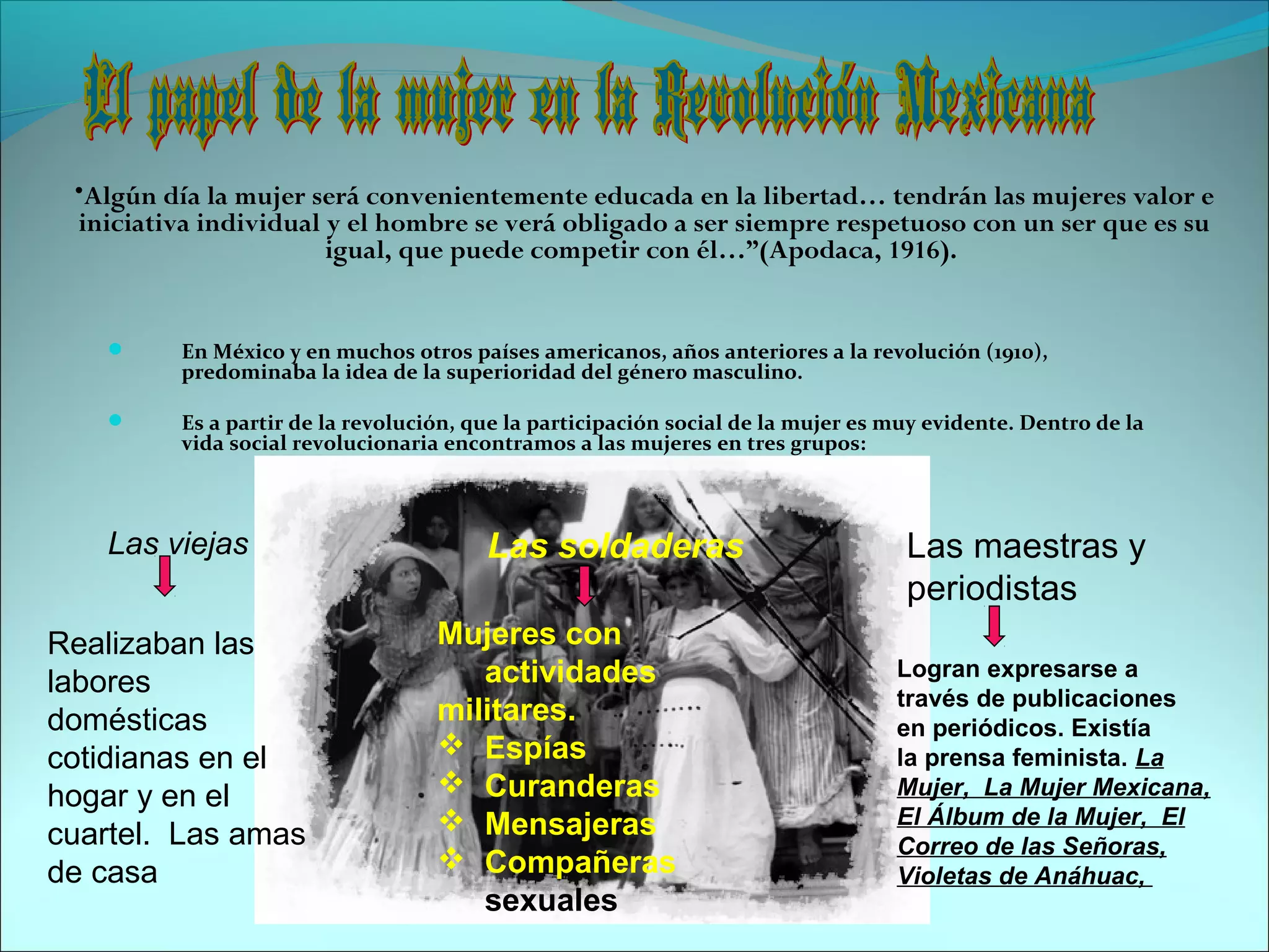 El documento describe los roles de género y la participación de las mujeres en México antes y durante la Revolución Mexicana de 1910. Antes de la revolución, predominaba la idea de la superioridad masculina. Durante la revolución, las mujeres participaron de tres formas: como "viejas" que realizaban tareas domésticas, como "soldaderas" que tenían funciones militares como espionaje o curación, y como "maestras y periodistas" que lograron expresarse a través de la prensa feminista. La revolución amplió la participación de