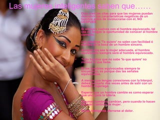Este documento ofrece consejos para que las mujeres sean más inteligentes y exitosas en el amor y en la vida. Recomienda no involucrarse con hombres equivocados, valorarse a sí misma, ser económicamente independiente, disfrutar la juventud, y adquirir habilidades y experiencias valiosas. También enfatiza la importancia de confiar en uno mismo y saber cuándo alejarse de relaciones o situaciones que no son saludables.