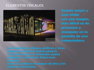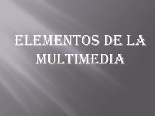 Este documento describe los diferentes elementos que componen la multimedia, incluyendo elementos visuales como imágenes y gráficos que deben ser formateados para que la computadora pueda manipularlos, elementos de audio como archivos de sonido en formatos como WAV y MP3, y elementos de organización interactivos como menús desplegables, barras de desplazamiento y hipervínculos que permiten al usuario navegar entre los diferentes componentes multimedia.