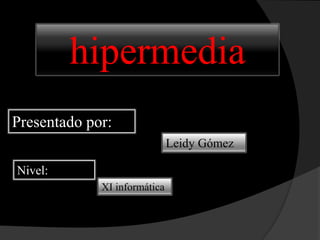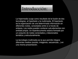 La hipermedia surge de la fusión del hipertexto y la multimedia. El hipertexto organiza la información en nodos conectados por enlaces, mientras que la multimedia integra diferentes medios como sonido e imágenes. La hipermedia ofrece una experiencia de navegación no lineal a través de esta combinación, brindando mayor riqueza y flexibilidad en la presentación de contenidos. Su diseño requiere considerar factores como la estructura de nodos, enlaces y herramientas de navegación para evitar la desorientación del usuario.