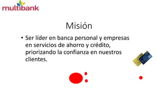 Multibank es un banco confiable cuyo objetivo es ser líder en servicios bancarios personales y empresariales como ahorros, cuentas corrientes, créditos y asesoramiento financiero. La misión del banco es priorizar la confianza de sus clientes. Los datos muestran que entre 2012 y 2014, Multibank y sus competidores El Banco y Credibank tuvieron variaciones en el monto de sus activos, situándose Multibank en el medio. El banco está organizado en divisiones como finanzas, comercial, recursos humanos