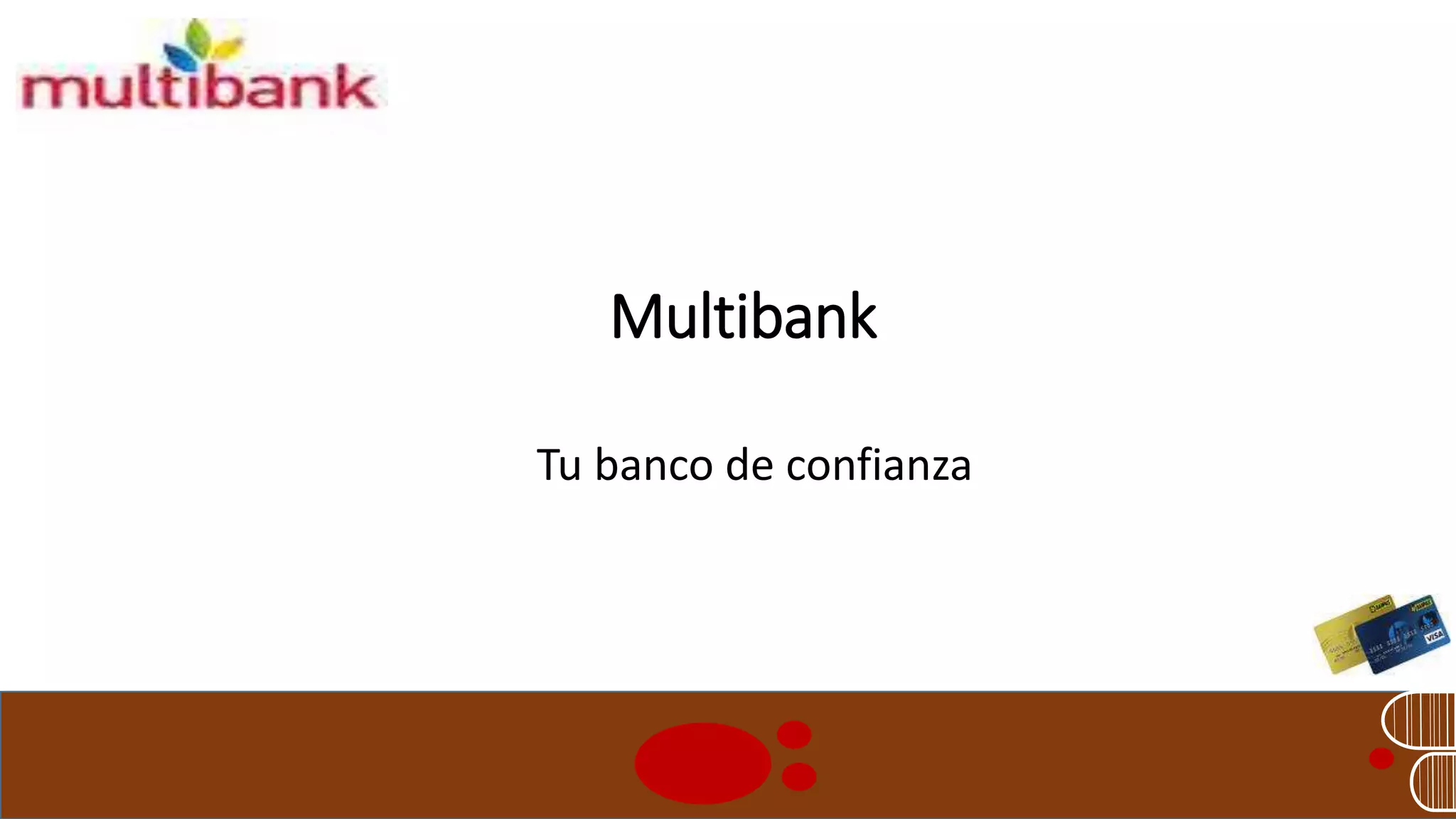 Multibank es un banco que tiene como misión ser líder en servicios de ahorro y crédito para clientes personales y empresas, priorizando la confianza de sus clientes. Ofrece servicios principales como cuentas de ahorros, cuentas corrientes, créditos personales y asesoramiento financiero. Un cuadro comparativo muestra los ingresos de Multibank y dos bancos competidores entre 2012 y 2014. La estructura organizacional de Multibank incluye una junta de accionistas, gerencias de finanzas, comercial, recursos human