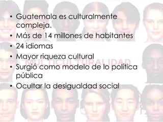 Guatemala es un país culturalmente diverso con más de 14 millones de habitantes que hablan 24 idiomas diferentes. La cultura guatemalteca incluye a los mayas, ladinos, garífunas y xincas, con idiomas como el k'iche, mam, k'aqchikel y q'eqchi. Aunque esta diversidad cultural ha dado lugar a discriminación y exclusión históricas, Guatemala se ha convertido en un modelo de política pública para promover la pluriculturalidad y ocultar las desigualdades sociales.