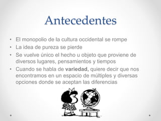 Este documento discute el discurso colonizador y descolonizador en relación al multiculturalismo. El discurso colonizador centraliza las ideas occidentales y define todo lo no occidental como "exótico y primitivo". El discurso descolonizador promueve una cultura de la diferencia no occidental a través de bienales periféricas como la Bienal de La Habana, que intentan articular culturas no occidentales en lugar de imponer perspectivas occidentales. La universalidad solo se logra a través del reconocimiento mutuo y respeto entre todas las civil