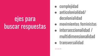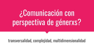 Este documento presenta diferentes perspectivas para abordar la comunicación desde una perspectiva de género, incluyendo la complejidad, la anticolonialidad, la interseccionalidad y la transversalidad. Propone adoptar un enfoque multidimensional e interseccional que reconozca cómo el género se cruza con otras categorías como la raza y la clase. También enfatiza la importancia de deconstruir los paradigmas simplificadores y adoptar una mirada compleja que reconozca la multidimensionalidad de los problemas sociales.