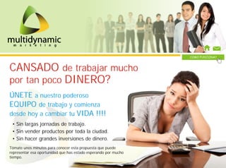 Multidynamic Marketing es una empresa que ofrece un modelo de negocio basado en ventas directas y afiliaciones, permitiendo a sus miembros ganar dinero al comercializar productos y afiliar a otros. Los interesados deben adquirir un token para acceder a la plataforma, donde pueden aprovechar distintas formas de ingresos, desde ventas hasta comisiones por afiliaciones. La compañía promueve un enfoque en la adquisición de activos sobre pasivos y se compromete a ofrecer productos legales y de calidad a precios competitivos.