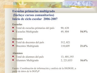 Este documento presenta estadísticas sobre las escuelas multigrado en México. Más de la mitad de las escuelas primarias son multigrado, atendiendo al 16.6% de los alumnos. Se propone un nuevo modelo educativo multigrado con innovaciones como un mapa curricular flexible, materiales para el aprendizaje autónomo y la formación de maestros para abordar las necesidades de las aulas multigrado.