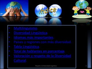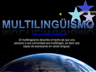 Este documento trata sobre el multilingüismo y la diversidad lingüística. Explica que el multilingüismo se refiere a la habilidad de expresarse en más de un idioma. Luego lista los idiomas más hablados en el mundo, los continentes donde se ubican y el porcentaje de hablantes de cada uno. Finalmente enfatiza la importancia de valorar y respetar la diversidad cultural y lingüística.