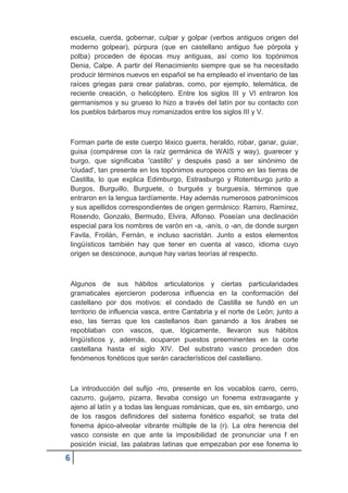 El documento describe el origen y evolución del castellano. Señala que el latín vulgar se propagó en España desde el siglo III a.C. y se impuso a las lenguas ibéricas y al vasco. Otras lenguas como el griego y el árabe también influyeron en el vocabulario del castellano. El vasco afectó la fonética del castellano con la introducción de la vibrante múltiple y la aspiración de las f iniciales.