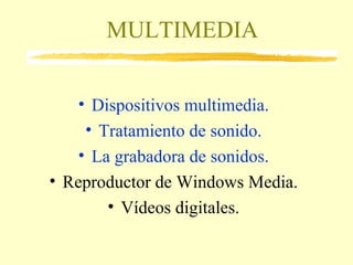 Este documento describe los dispositivos y programas multimedia más comunes. Explica cómo la tarjeta de sonido convierte el sonido analógico en digital y viceversa, y cómo la grabadora de sonidos y el reproductor de Windows Media permiten grabar, editar y reproducir archivos de audio y video. También cubre formatos comunes como MP3, WAV y AVI.