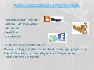 El documento habla sobre la factibilidad de producir un proyecto de multimedia que involucra la edición de fotografía, audio y video. Se requieren conocimientos básicos de manejo de blogger, edición, periodismo y ortografía. El proyecto podría enfrentar desafíos como problemas técnicos o falta de organización. Sin embargo, es viable realizarlo debido a que el equipo cuenta con los conocimientos y herramientas necesarias como computadoras, cámaras, software y habilidades, y no requiere inversión económica.
