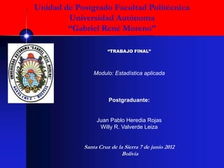 Este documento presenta los resultados de una encuesta sobre la percepción de docentes de posgrado sobre el uso de Facebook en la educación superior. La mayoría de los encuestados tenían entre 26-30 años y experiencia docente de 1-10 años. Los resultados mostraron que el 60% no tiene una percepción favorable sobre usar Facebook, y que su nivel de comprensión sobre TIC es bajo. Las conclusiones fueron que la hipótesis se confirmó y que la percepción del uso de Facebook en posgrado es baja.