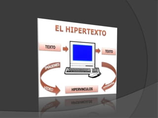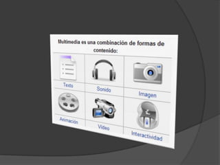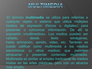 El documento define multimedia, hipertexto e hipermedia. Multimedia se refiere a cualquier objeto o sistema que utiliza múltiples medios como texto, imágenes, animación, sonido y video para presentar información. Hipertexto permite navegar entre textos relacionados haciendo clic en enlaces. Hipermedia designa contenidos integrados que incluyen varios medios como texto, imágenes, video y audio, permitiendo la interacción con los usuarios.