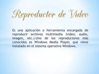 El documento aborda herramientas y aplicaciones en la educación, incluyendo reproductores multimedia como Windows Media Player y el proceso de edición de vídeo. También se menciona la función de los conversores de vídeo que permiten cambiar formatos. Estas tecnologías son relevantes en el ámbito educativo para la producción y reproducción de contenido audiovisual.
