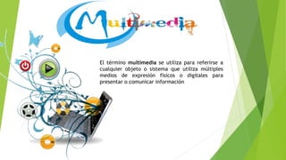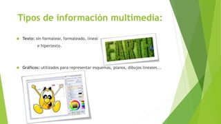 El documento define el término multimedia y describe los diferentes tipos de información multimedia, incluyendo texto, gráficos, imágenes, animación, video y sonido. Luego clasifica los diferentes tipos de multimedia según su finalidad o medio de publicación, mencionando la multimedia educativa, publicitaria, comercial e informativa.