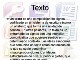 El documento resume los diferentes tipos de elementos multimedia como texto, gráficos, imágenes, animación, video y sonido. Define texto como una composición de signos codificados con una intención comunicativa. Explica que los gráficos son cualquier imagen generada por una computadora para representar información visual. Describe imágenes como representaciones bidimensionales de matrices numéricas en formato binario o vectorial. Señala que la animación es el proceso de dar sensación de movimiento a imágenes mediante uno o más animadores. Finalmente, define video como la tecnología para gra
