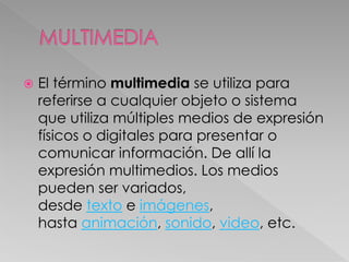El documento define multimedia como cualquier sistema que utiliza múltiples medios como texto, imágenes, sonido y video para presentar información de manera interactiva. La multimedia mejora la comprensión al involucrar más sentidos como en la comunicación humana. Incluye ventajas como presentaciones atractivas y aprendizaje adaptado a cada usuario. Describe tipos de información multimedia y sus usos en educación, publicidad, comercio e información.