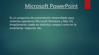 El documento define multimedia como cualquier sistema que utiliza múltiples medios como texto, imágenes, animación y sonido para presentar información. Luego describe a Microsoft PowerPoint como un programa de presentaciones ampliamente usado en educación y negocios que permite crear diapositivas, cada una con elementos como texto, gráficos, videos e imágenes. Finalmente, recomienda que las diapositivas sean simples, a medida, con imágenes claras y usar transiciones solo cuando sean necesarias.