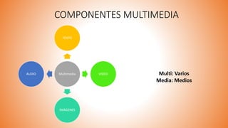 Este documento describe los componentes multimedia como texto, video, imágenes y audio. También presenta información sobre la banda de rock alemana Scorpions y sobre la música andina de Latinoamérica, incluyendo canciones y bailes peruanos. Además, menciona instrumentos musicales poco convencionales como el mini cello, la flauta sub y el clarinete de zanahoria.