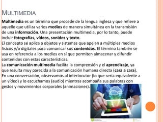 El documento habla sobre multimedia y sus características. Define multimedia como el uso de múltiples medios como fotografías, videos y texto para transmitir información de manera simultánea. Explica que la comunicación multimedia facilita la comprensión al ser similar a la comunicación humana cara a cara. Luego describe los diferentes tipos de información multimedia como texto, gráficos, imágenes, animación, video y sonido.