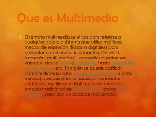 El documento explica el concepto de multimedia, que abarca diversos medios de expresión como texto, imágenes, sonido, y video para comunicar información. Se destacan los tipos de multimedia, incluyendo la multimedia interactiva, que permite al usuario controlar la presentación del contenido. También se describen distintos elementos y técnicas de creación multimedia, así como la importancia de conocer al público y definir mensajes clave para una comunicación efectiva.