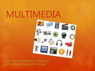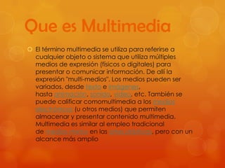 El documento define varios tipos de multimedia como texto, gráficos, imágenes, animación, video y sonido. Explica que la multimedia interactiva permite al usuario controlar la presentación del contenido. También describe características clave de la multimedia como que puede verse en vivo o reproducirse localmente y transmitirse de forma analógica o digital.