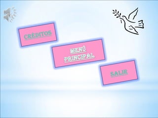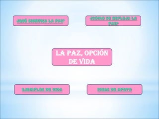El documento presenta información sobre el significado y la práctica de la paz a través de varias secciones. Define la paz como una opción de vida que se logra mediante valores positivos como el respeto, la tolerancia y el amor. Explica que la paz se refleja en acciones como reconocer los sentimientos de los demás, aceptar diferentes perspectivas, y unirse a causas comunes. Finalmente, propone formas de practicar la paz como interiorizar mensajes de canciones inspiradoras y reflexionar sobre frases célebres
