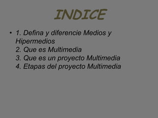 Este documento define medios, hipermedios y multimedia. Explica que los medios facilitan lograr un objetivo de manera general mientras que los hipermedios son documentos que contienen texto, gráficos, video y audio para apoyar el documento. Define multimedia como el uso de múltiples medios de expresión para presentar contenido digitalmente. Indica que un proyecto multimedia permite mezclar ideas como imágenes y sonidos para crear una interacción, y que las etapas de un proyecto multimedia son el diseño de información, interfaz e interactiv