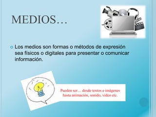Este documento define los medios, hipermedios y multimedia. Explica que los medios son formas de expresión físicas o digitales para presentar información, mientras que los hipermedios organizan la información usando recursos informáticos como páginas web. También describe las tres etapas clave para producir un proyecto multimedia: definir el tema, diseñar el proyecto y desarrollarlo y producirlo usando herramientas multimedia.