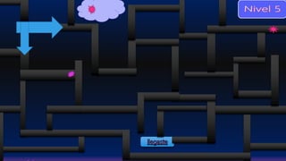 Este documento presenta un juego interactivo en el que el objetivo es guiar un puntero del mouse a través de un camino evitando obstáculos. El jugador avanza de nivel a medida que completa cada etapa de manera exitosa. El documento también proporciona información sobre la autora, las fuentes de las imágenes y música utilizadas.