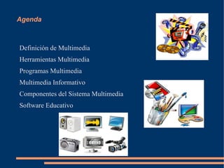 Este documento define multimedia como un sistema que combina texto, imágenes, animación, sonido y video para transmitir información de manera interactiva. Explica las herramientas y programas multimedia, incluyendo software educativo, y describe sus usos en educación, negocios, hogares y lugares públicos.