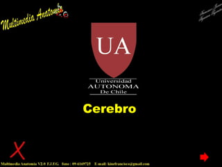 El documento describe las principales estructuras del cerebro y la médula espinal, incluyendo los lóbulos cerebrales, giros, surcos y otras características anatómicas. Se proporcionan detalles sobre la localización y función de áreas como el cerebelo, tronco encefálico y sistema nervioso periférico.