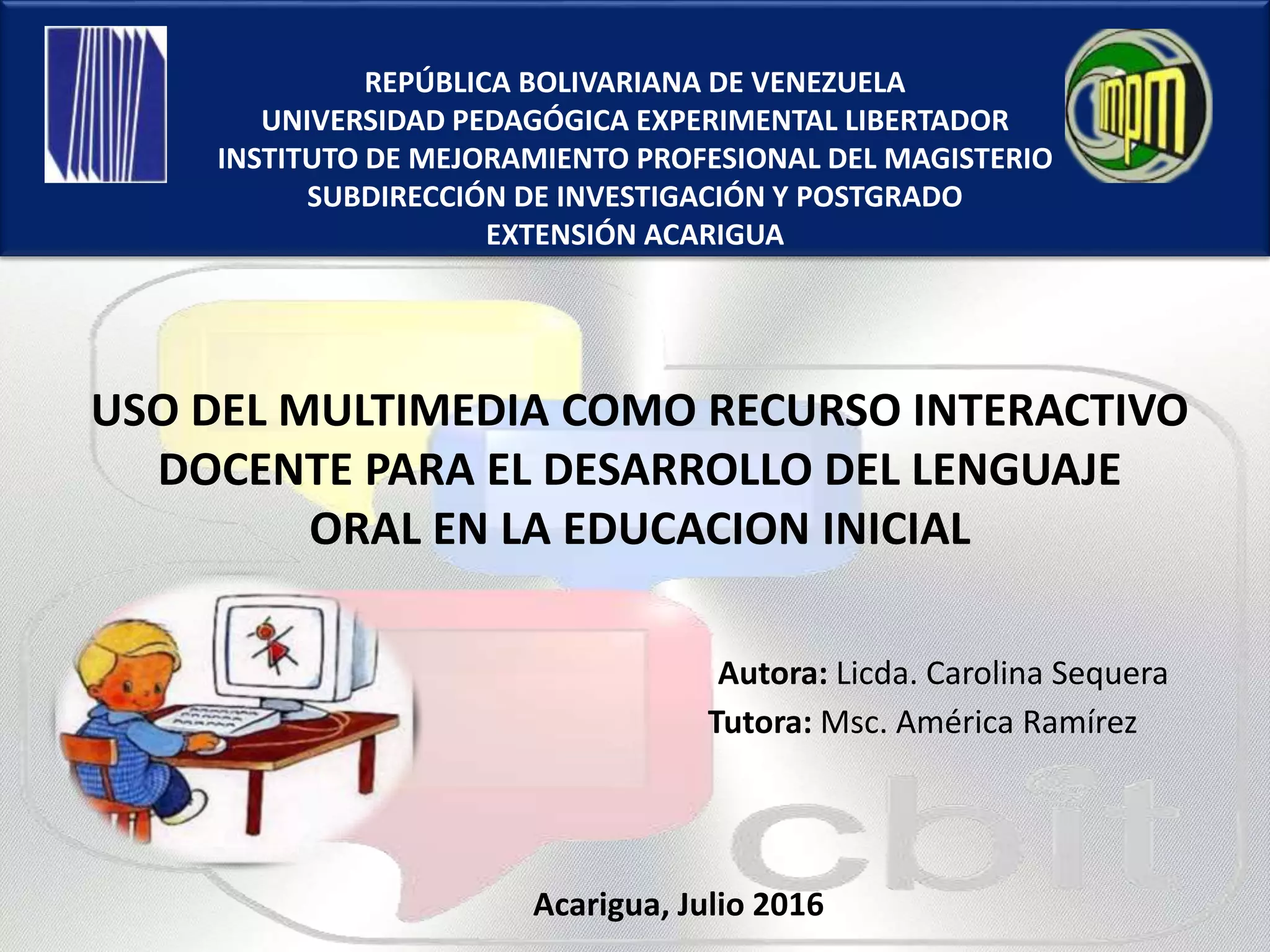 Este documento propone el uso del multimedia como recurso interactivo para desarrollar el lenguaje oral en la educación inicial. El objetivo es diagnosticar la necesidad de implementar este recurso y diseñar actividades multimedia que apoyen el desarrollo del lenguaje oral en los niños. Se basa en teorías como la de Vigotsky sobre el aprendizaje social y la de Piaget sobre el desarrollo cognitivo. El estudio utilizará un enfoque cuantitativo no experimental para evaluar la factibilidad e implementación de este recurso a través de ent